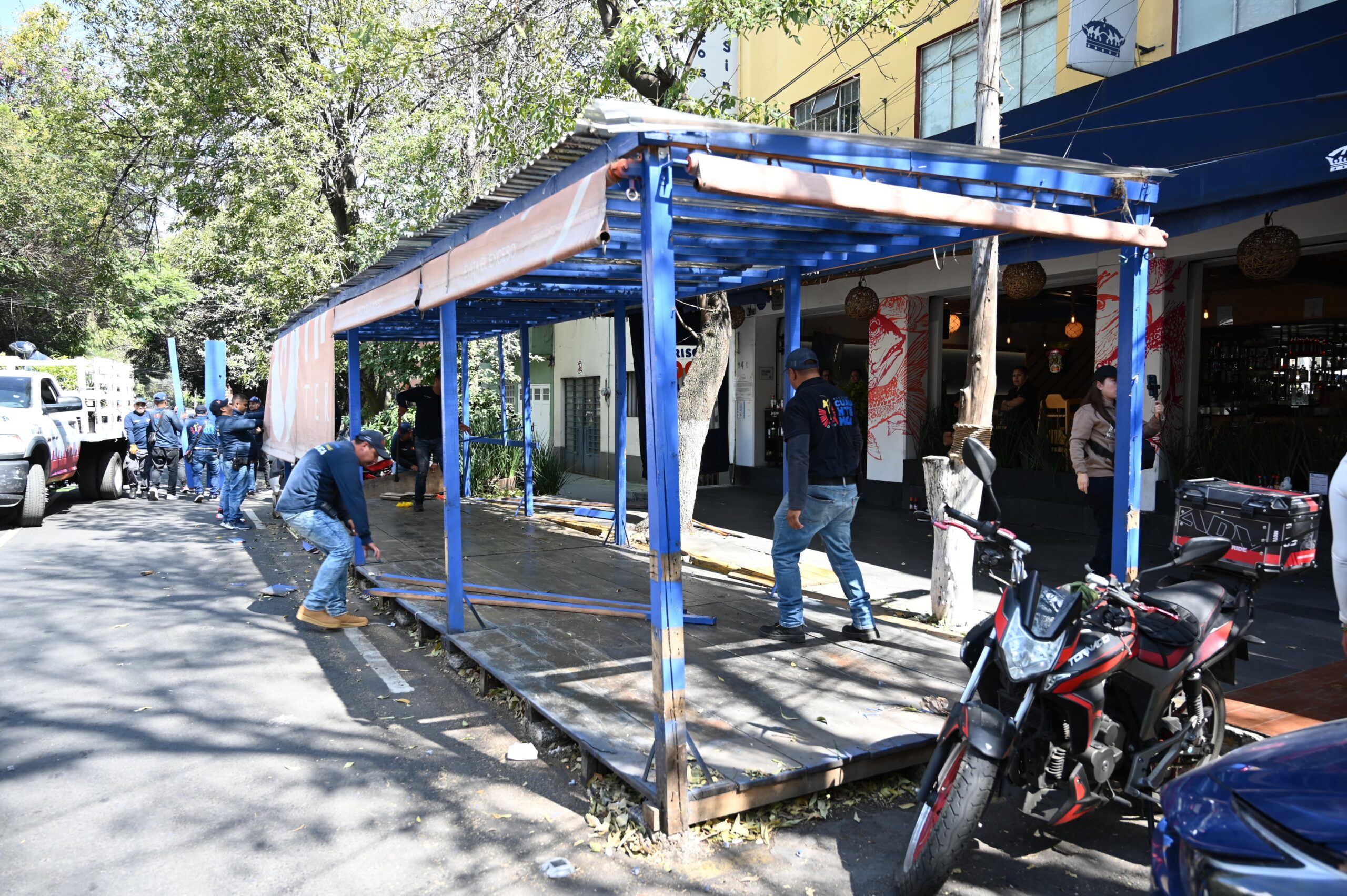 La alcaldesa Alessandra Rojo de la Vega encabezó un operativo de retiro de dos pérgolas instaladas sin acreditar los permisos correspondientes en la Condesa, como parte de las acciones permanentes de ordenamiento y recuperación del espacio público que realiza el Gobierno de la Cuauhtémoc.