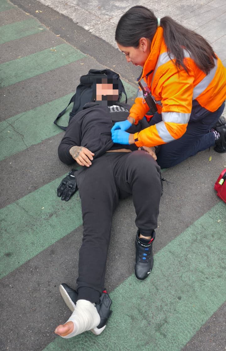 Elementos de la Dirección de Gestión Integral de Riesgos y Protección Civil de la Alcaldía Cuauhtémoc atendieron a un motociclista que resultó lesionado en un accidente de tránsito ocurrido en el cruce de Avenida Insurgentes y Amado Nervo, en la colonia Santa María la Ribera.