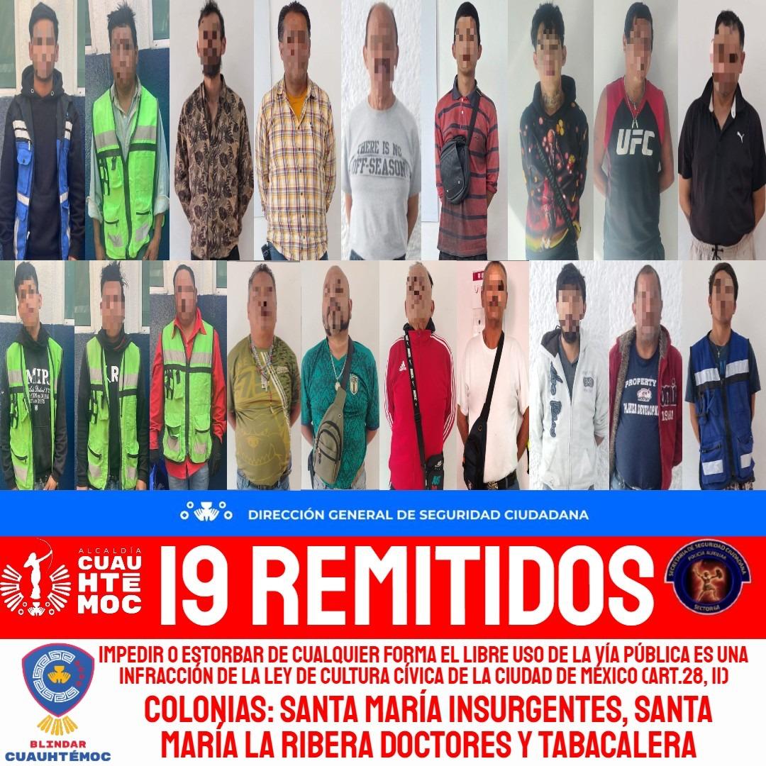 Las acciones se llevaron a cabo en las colonias Asturias, Buenavista, Maza, Doctores, Centro, Guerrero, Peralvillo, Obrera, San Rafael, Santa María la Ribera, Roma y Tabacalera, como parte de los operativos de presencia policial implementados de manera constante en las 33 colonias de la demarcación.